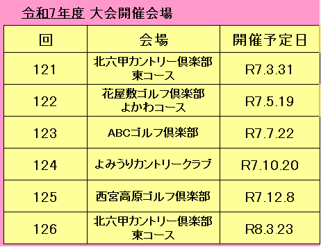 第112回大会(5月16日西宮高原ゴルフ倶楽部)は、兵庫県民ゴルフ決勝大会(11月27日、よみうりカントリークラブ、ダブルペリア方式)の地区予選会を兼ねて開催されます。