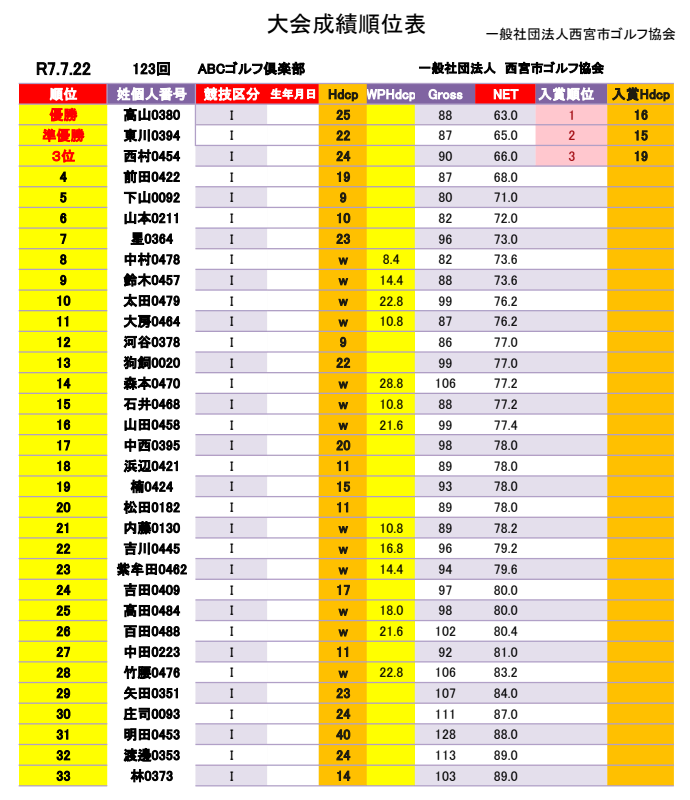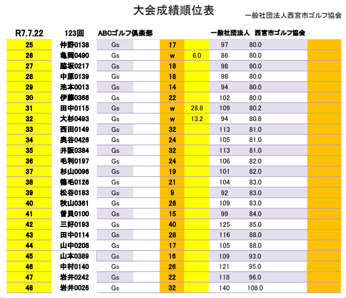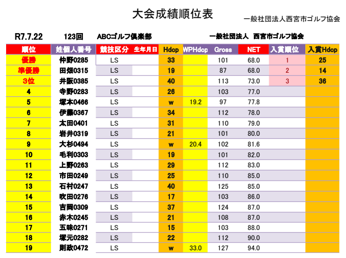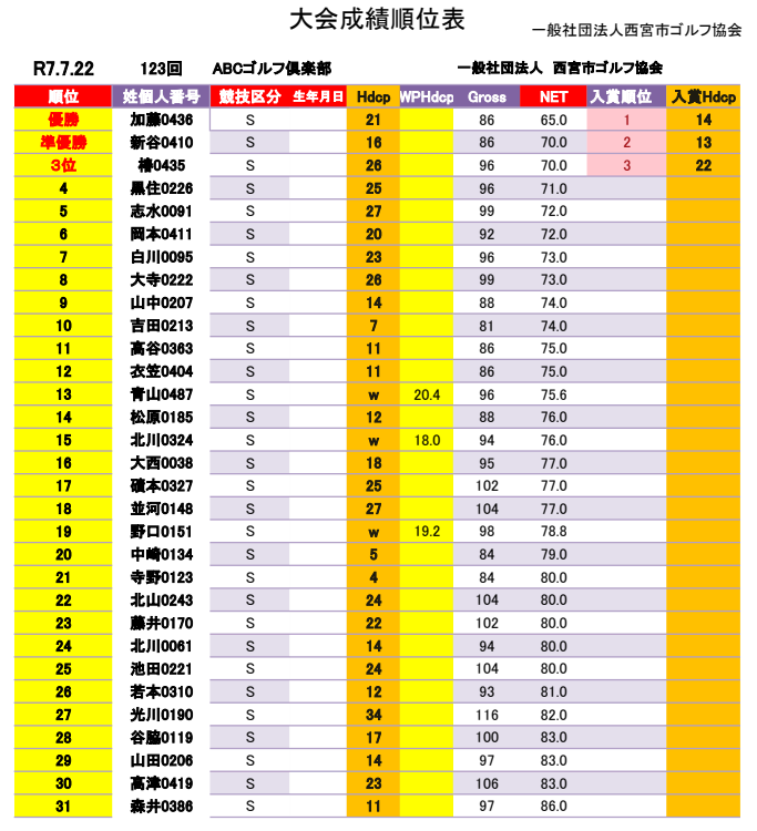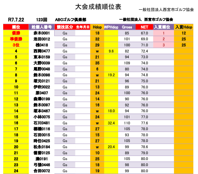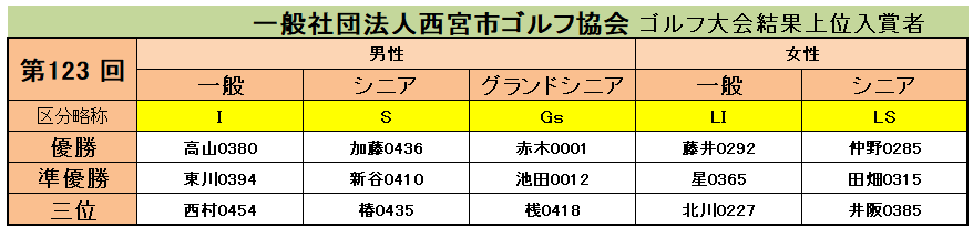 第123回大会(ABCゴルフ倶楽部)競技区分別成績表は以下の通りです。酷暑の中、皆様の努力にて無事に大会を終えることができましたことに感謝いたします。また、ABCゴルフ倶楽部のご協力とキャディの方々の良きアドバイスで乗り切れたことと思います。
