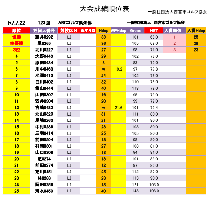 成績表は、兵庫県ゴルフ連盟のサイトに掲載されておりますのでそちらのページをリンクしておきます。